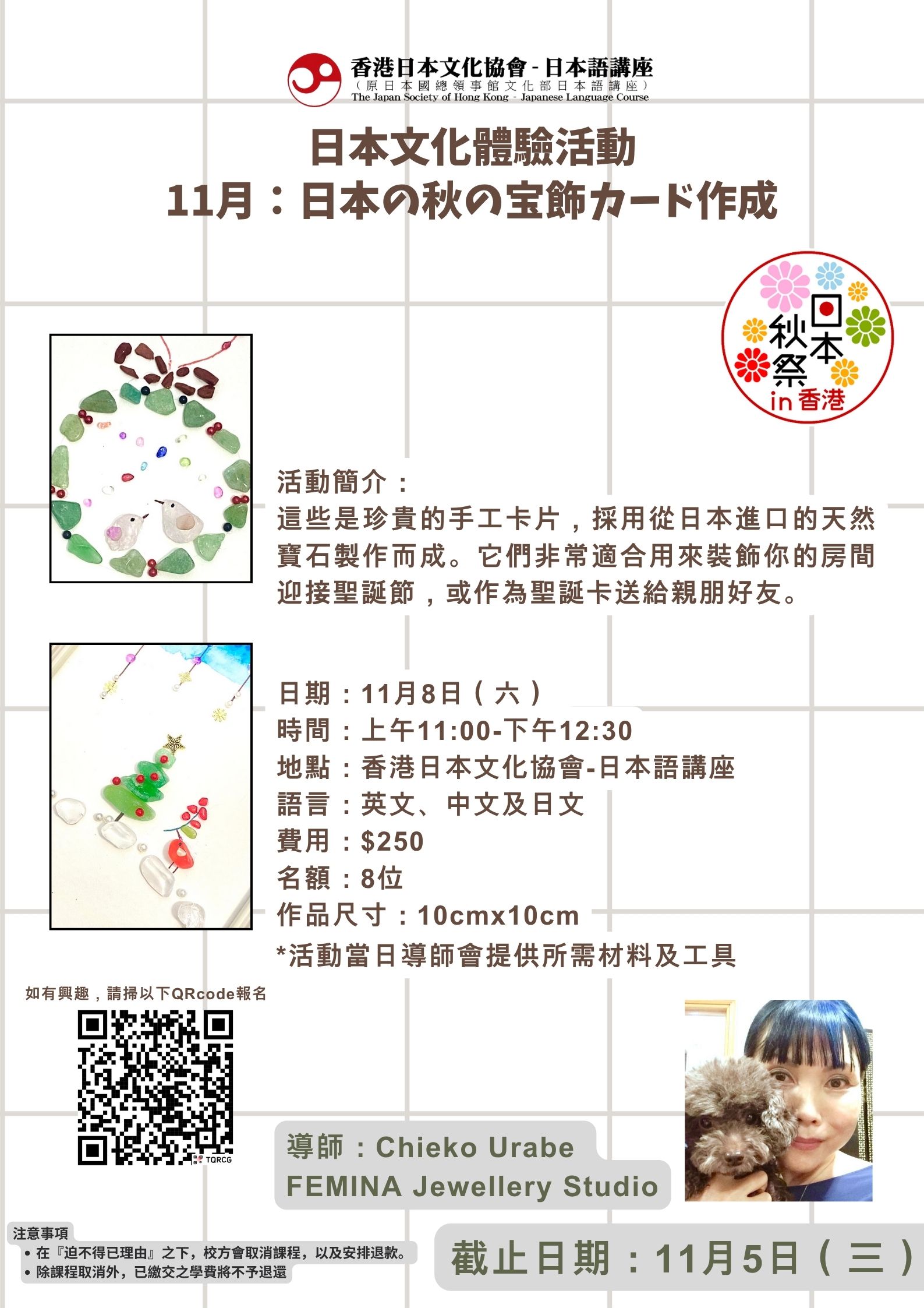 Lecturer Ms. Urabe Chieko, the owner of FEMINA Jewellery Studio, will teach how to make cards, using gem decoration.
