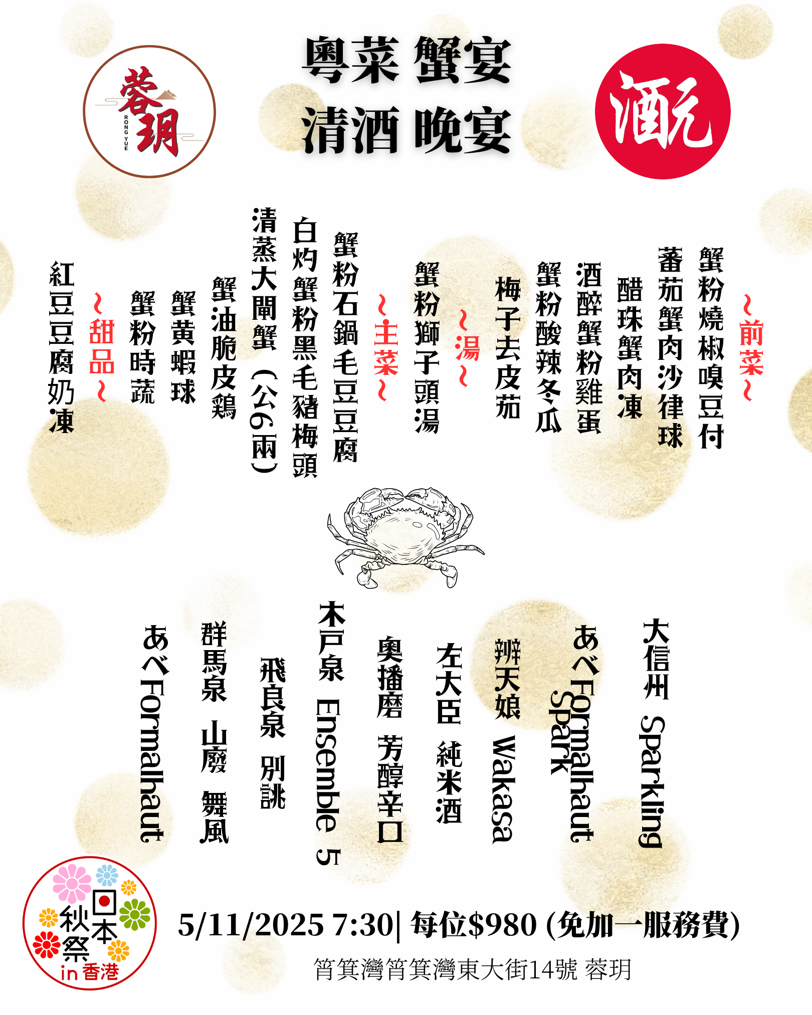 Japan Autumn Festival in Hong Kong 2025 > Search > 大閘蟹宴與日本清酒 By酒元商店Oliver Chan