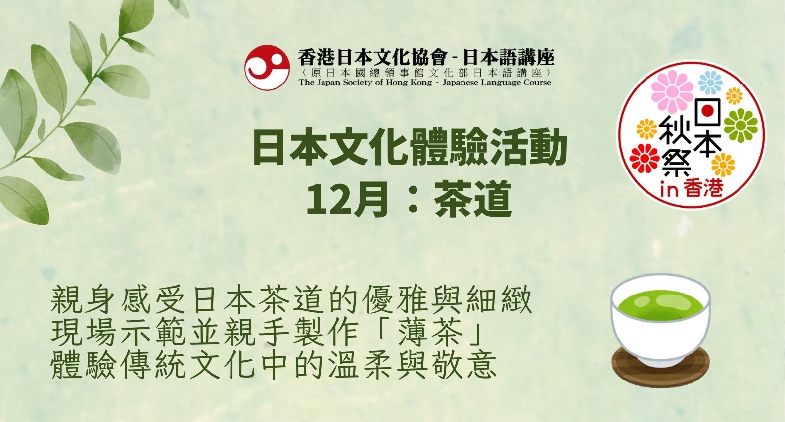 介紹日本的傳統文化——茶道,並加深大眾的理解,茶道裏千家淡交會香港協會的幹事長室田老師將在香港城市大學茶室進行茶道介紹,為參與者提供日本文化體驗。