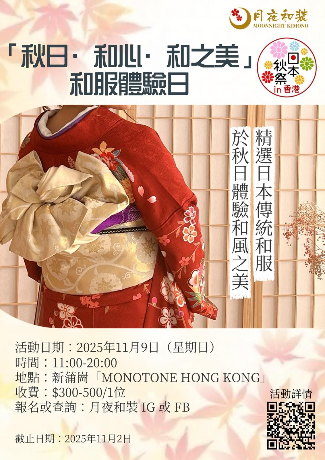 現在機會來了!由「月夜和裝」主辦的「秋日。和心。和之美 : 和服體驗日」,提供各種正統的和服及穿着服務,配合多彩多樣的配飾道具,於日式實景影樓與摯親摯愛,三五知己進行開心難忘的「和服體驗之旅」!