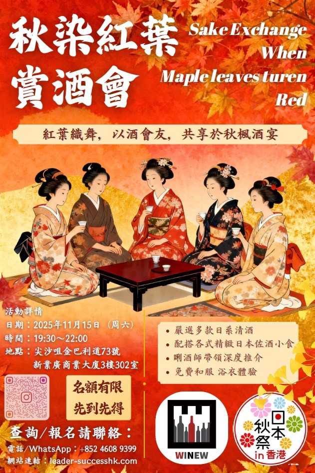今年秋季,Winew誠意呈獻以秋祭為主題的品酒活動——「秋染紅葉」賞酒會。活動將提供多款日本酒,包括清酒及果酒,配搭各式精緻的日本佐酒小吃,讓您沉醉於美酒與美饌交織的和風盛宴。
