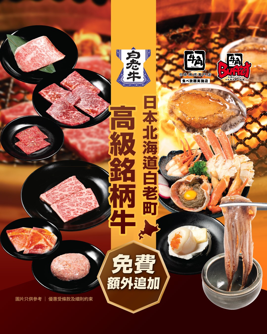 即日起到牛角Buffet及放題實施店惠顧「伝説の焼肉」尊享無料追加北海道白老牛三個不同部位、白老牛漢堡、北海道千歲う米豚肉眼等15項燒肉商品,更兼享Lv 1-4全190品起放題! 同時繼續無限追加日本九州A4+和牛肉眼、西冷、日本松葉蟹腳、味噌蟹肉甲羅燒、燒鴨肝等!