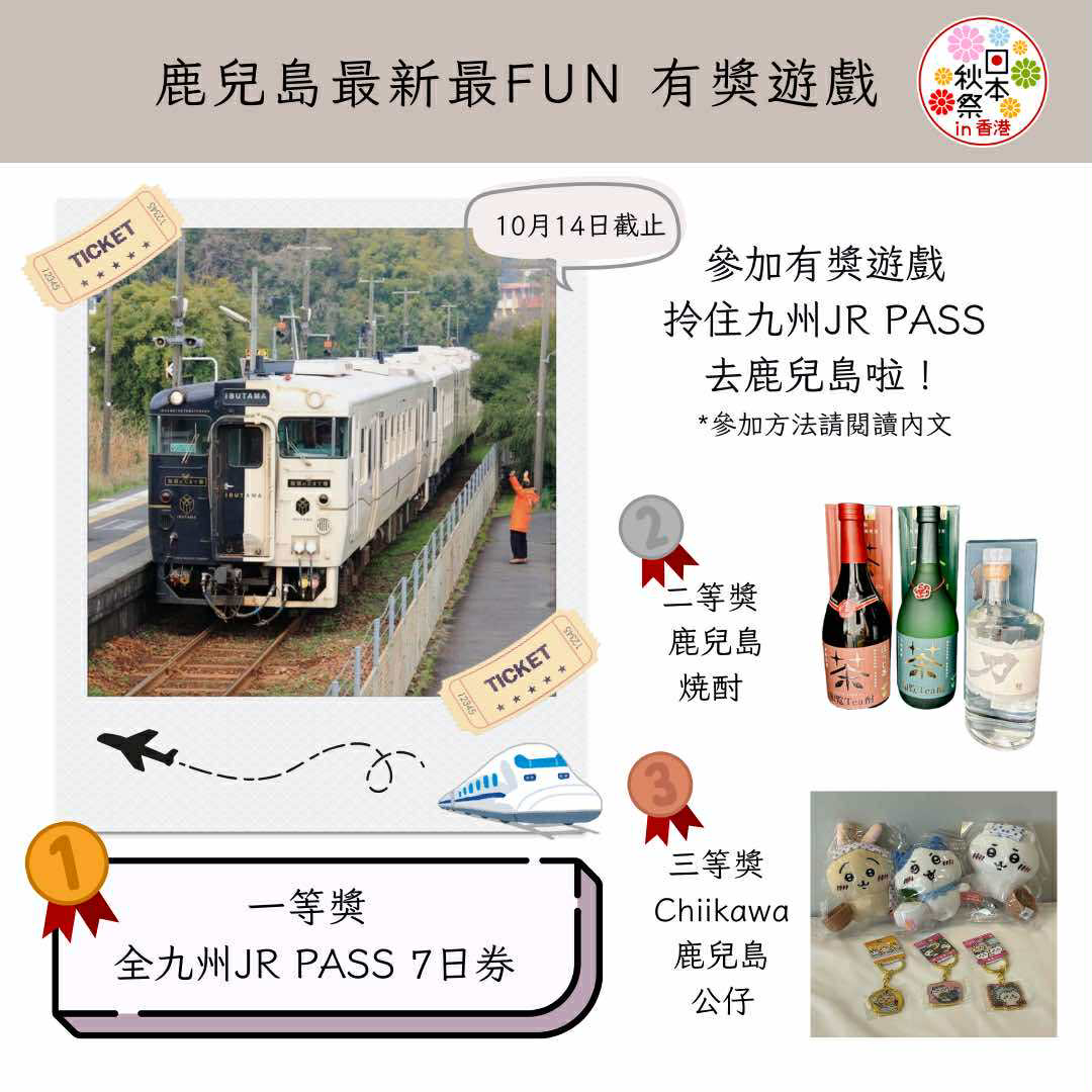 於貼文留言你嘅鹿兒島秋日旅行計畫 、讚好「鹿兒島最新最Fun」Facebook 專頁及此貼文以及Tag 你的朋友,即可參加。